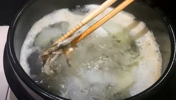 한 번 더 끓어오르면 거품을 걷어내 주시고요.