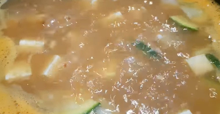 불을 켜고 된장물이 끓어오르면 썰어놓았던 양파와 호박, 두부를 다 넣어주세요.