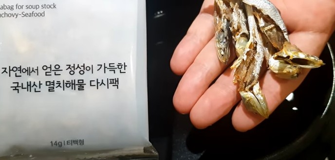 여기에 내장을 제거한 국물용 멸치 5마리나 이런 다시팩을 하나 넣어주세요.